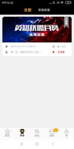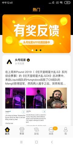 头号玩家app是一个第三方多功能赛事平台,含有:社区、比赛、聊天等功能;