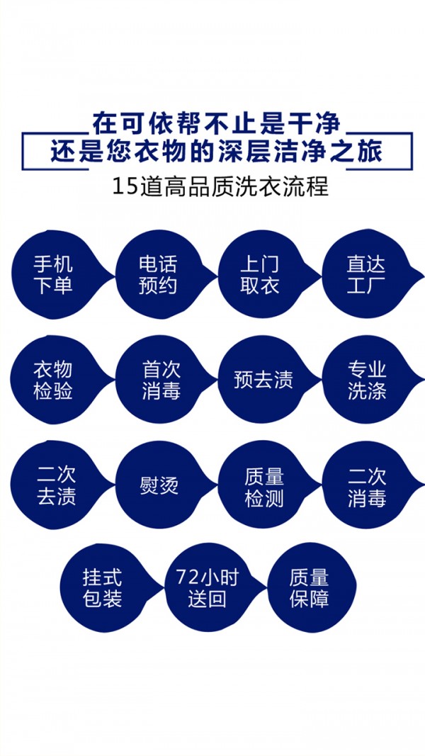在许昌地区首创手机预约上门取送、72小时送回服务,采用中央工厂集中洗护的方式,使您足不出户,就能享受到“低价位、高品质”的五星级专业洗护服务。