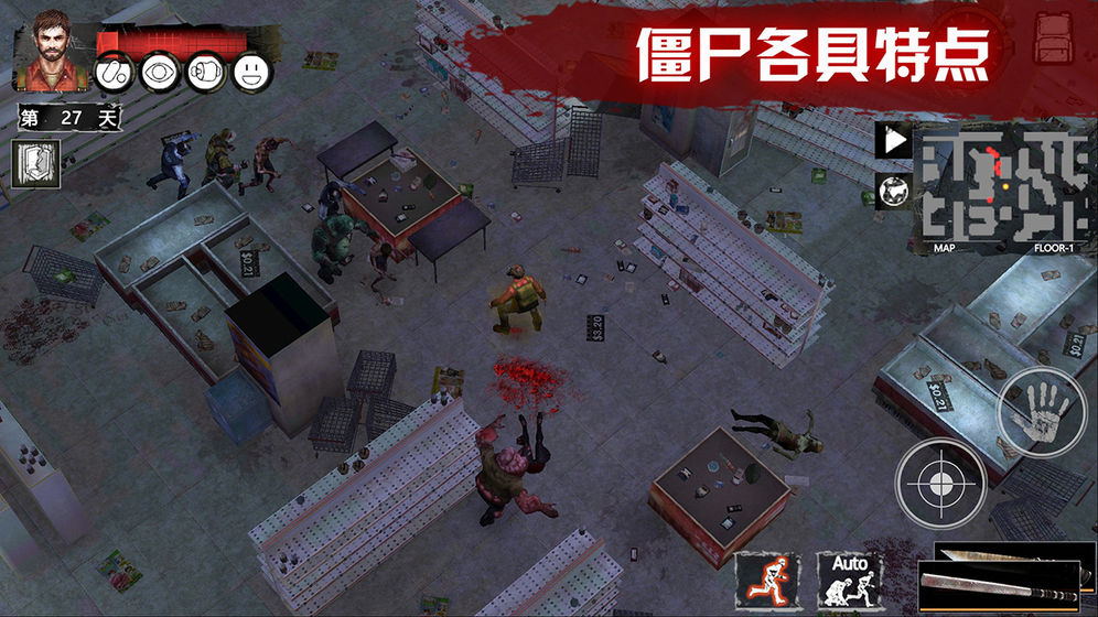 游戏中潜行是非常重要的概念,角色会听到僵尸的动静后自动进入潜行状态(自动模式按钮开启的情况下),如果周围范围没有僵尸活动,则自动进入奔跑状态。所有战斗均会消耗对应的物品道具,那么如何有效的消耗道具造成更大的效果则成为此部分的核心乐趣。