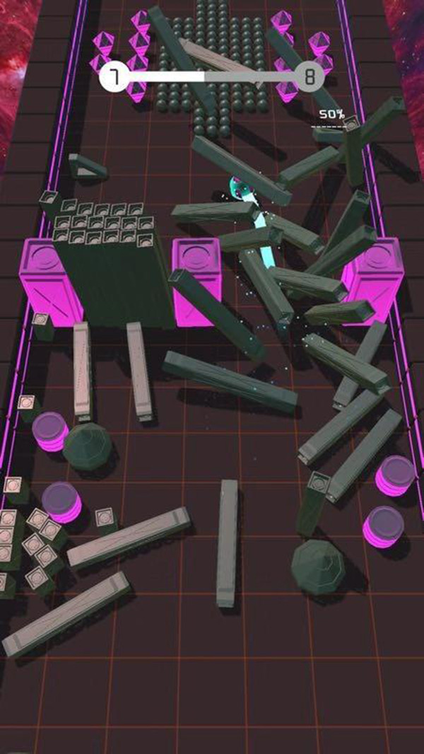 3、一口气玩到70多关,核心玩法就三种,按照同颜色轨迹拖动小球,用同颜色板把障碍物推开,用同颜色球把障碍物撞开,然后就没了,另外还要注意下双层且上下颜色不一样的障碍物,推开了下面的上面的并不会跟着一起走而是直接掉下来砸头,不想被砸的话就超快速划过去或者拐弯。