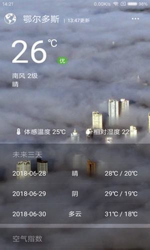 【天气展示】天气主页显示所选城市的气象数据。左右滑动可展示所添加的其他城市的天气。下滑刷新功能可随时随地更新天气数据。包括实时板块:温度、风力、天气、空气质量、湿度等;预报板块:展示未来三天的天气状况;空气板块:展示当前的空气质量指数、pm2.5、pm10、一氧化碳、二氧化硫等空气污染物指数;生活板块:舒适指数、运动指数和洗车指数等。
