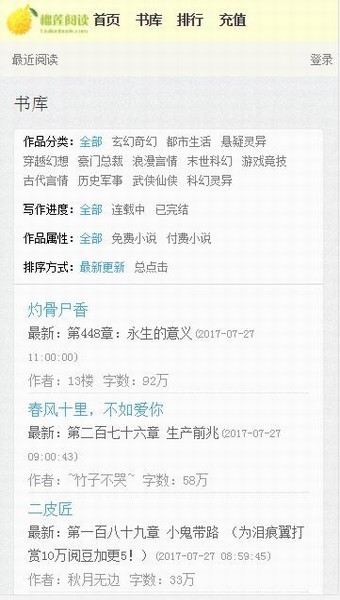 2、书库:作品分类、写作进度、作品属性、排序方式,快速查询资源