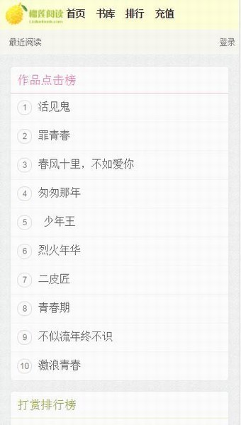 3、排行榜:作品点击榜、打赏排行榜、收藏排行榜、数字排行榜、新书排行榜、完本排行榜、