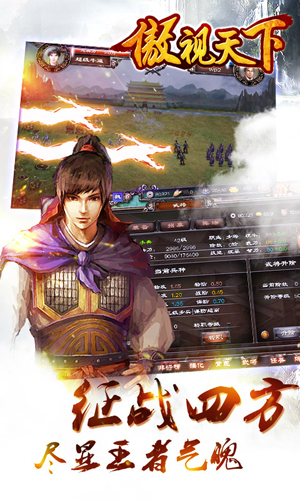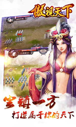 傲视天下与卧龙吟一样,同为三国题材,游戏内容上基于三国的历史,在剧情副本上再现三国的著名战役,比如耳熟能详的官渡之战、赤壁之战、夷陵之战等等,而三国中叱诧风云的名将也将一一出现,关羽、张飞、赵云、典韦、吕布,所有名将任由玩家招募,组成玩家征战天下的军团。玩家在游戏中选择加入魏蜀吴任意一国,成为其中一方势力,由最初仅有一座小城一员战将一点兵力,通过游戏提供的各色系统来不断升级城池、招募武将、打造极品装备、通过副本战役、挑战百战塔、汉将副本、建立军团抢占资源和州郡,一直发展壮大自己,最终可以发展成为称霸一方的诸侯,甚至游戏中还将提供终极追求,成为一国国君,掌控国家。