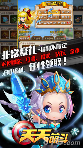 《天天萌斗》是一款打破题材时空界限、离散开放式的超级盟卡牌对决手游,”超级盟“即代表游戏不止一个世界观、阵营、联盟,玩家面对的不止一个次元的对手,华夏、幻想、魔幻、超能还有日漫,更多未知的题材在等待玩家探索。超多玩法、卡牌搜集、大陆征战、角色养成、装备打造、宝物合成和世界boss、竞技场pk、跨服联赛等等,在这里,体验快节奏、扫关卡、炫特效、爽到底的卡牌激斗。