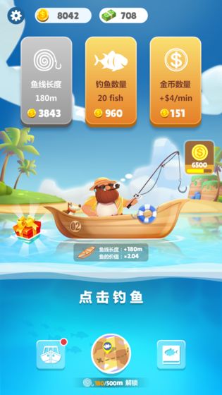1、休闲卡通风格的画面,当鱼上钩时,进行疯狂点击,把它拉上来。
