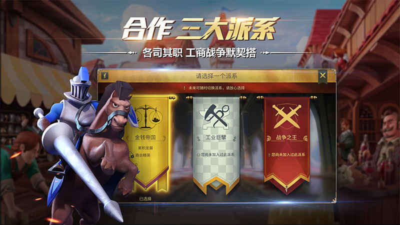 金钱帝国、工业巨擘、战争之王三大派系,天赋各不相同,不同派系玩家可以相互合作,让效益实现最大化
