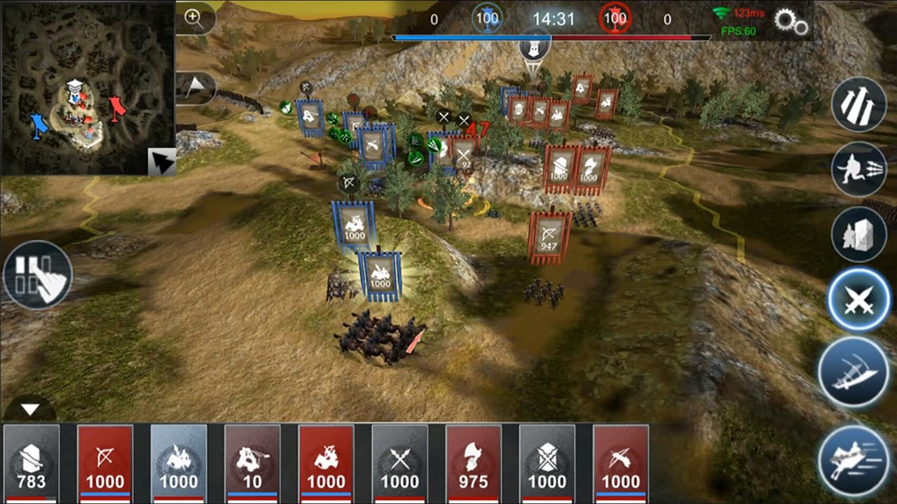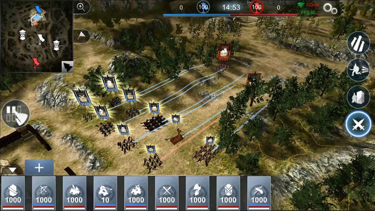 在战斗时间内全歼敌军,占领敌方大旗即可取得胜利。当战斗时间结束还未分出胜负时,等分高者胜出。击溃敌军方阵,占旗占塔都将获得分数。