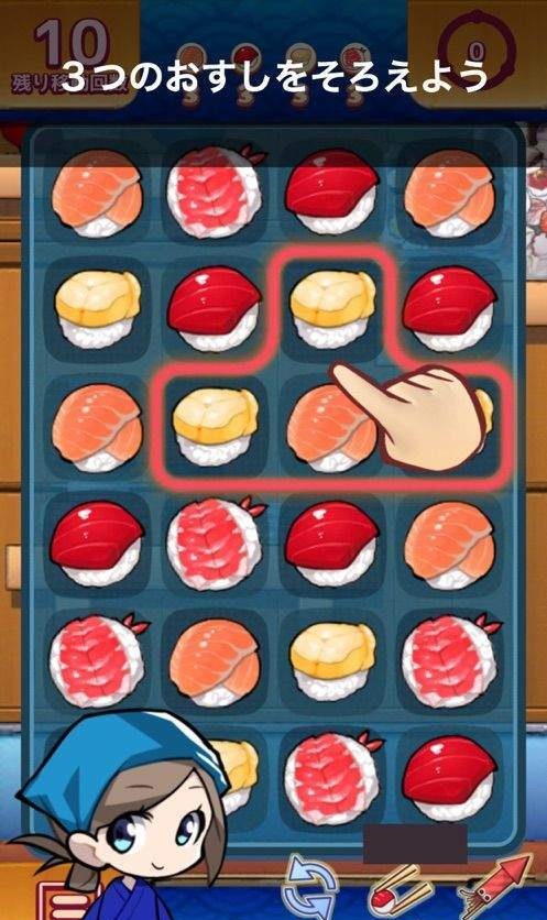 游戏的主要玩法为三消,用你强大的能力将一个个寿司全部的变成金钱,游戏的画风Q版可爱,还有海量关卡等你来挑战。