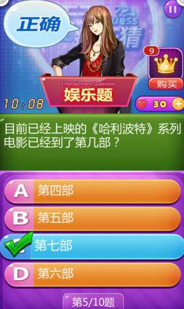 天天疯狂猜是一款益智类的答题游戏,采用选择题的形式来找出正确答案,题目轻松搞笑,时尚专业。游戏采用精美的日式画风,分为娱乐题、百科题、音乐题、游戏题、体育题、动漫题。
