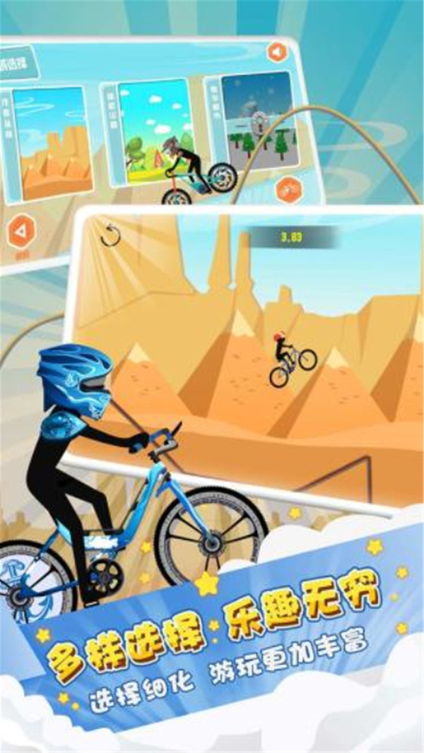 火柴人漂移赛是一款休闲的2D竞速闯关游戏。玩家需要控制一个火柴人在游戏中的各种地图上不断挑战。游戏的画面非常卡通,简洁的火柴人却骑着细节丰富的自行车,甚至它身上穿的装备都比它细节多,这或许就是火柴人的魅力