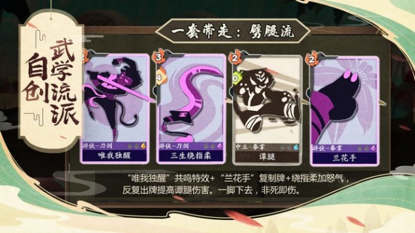 特别精细的人物造型给玩家带来了全新的感觉,酷炫的特效更是让每个玩家都能体验到不同的乐趣,武侠江湖幻境冒险,独树一帜的世界观架构,精美卡牌收集,所有的武器都会随着你的运用次数和理解变得越来越强大,烧脑策略比拼,热血极致回合,非常经典的武侠卡牌游戏!