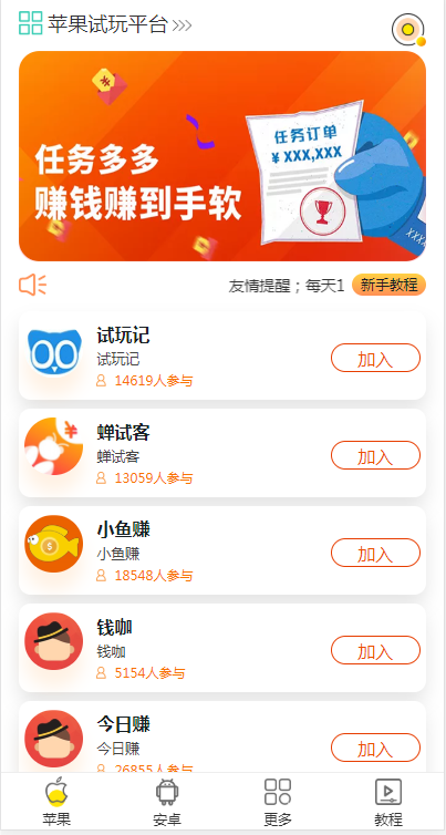 根据提示完成指定的试玩任务和下载应用就可以获得现金奖励的平台,App试玩体验师又名苹果试玩平台,这里的任务非常多,每天更新,不限时间和地点,赚的钱直接提现。