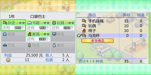 玩家要经营一家卖日用生活用品的公司,不单单是进货以及价格,还有顾客对商品的受欢迎程度以及在这个公司附近的一些发掘工作,从而能更好的吸引顾客以及卖掉商品。
