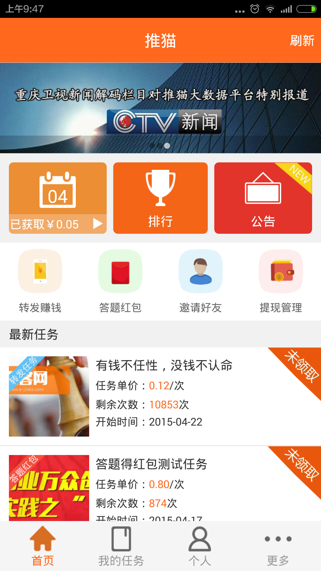 1.个人中心:有您的收入详细,可提现,还有您的一些设置。