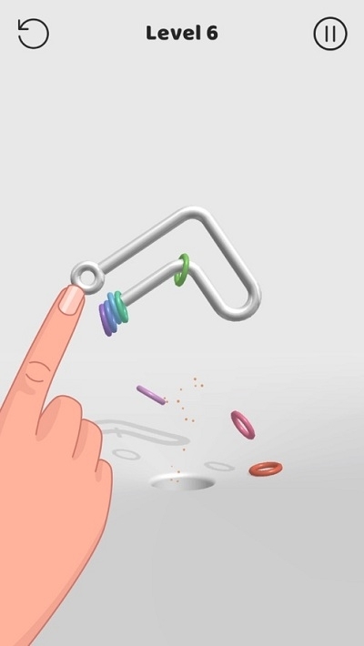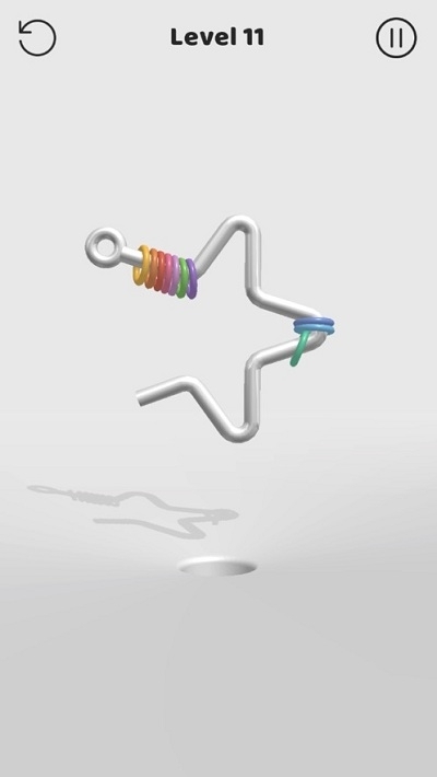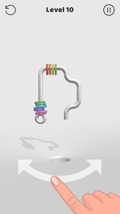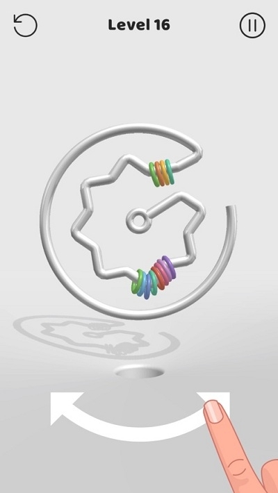 2、在关卡中掌握技巧,动动手指来转动金属钩,找准时机让不同颜色的圈进洞;