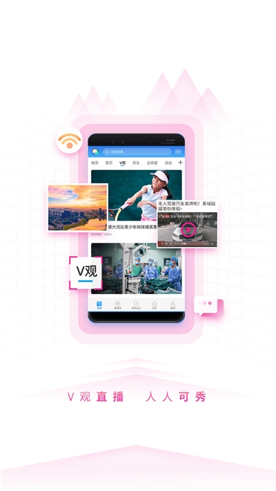V观直播、图集、音频、短视频、机器人播报等多元化内容形式。