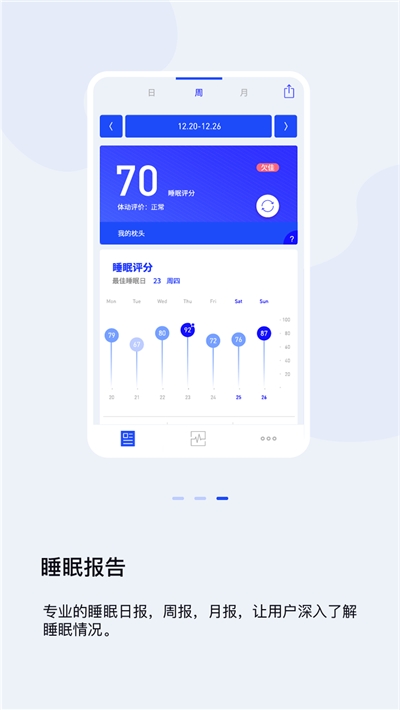 分析用户的睡眠周期,并结合各个睡眠时间和身体特征数据,输出完整专业的睡眠报告,也可以通过查看周报和月报展示其长期的睡眠变化趋势。