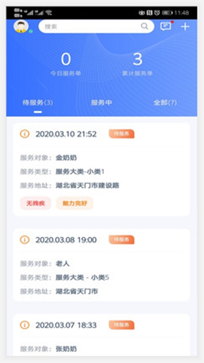 可以查看各种不同状态的服务订单,包括待服务、已完成、已取消等的订单