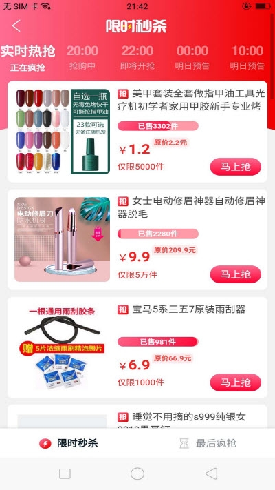 1、限时抢购:每日限量超值商品,准点开抢秒杀;