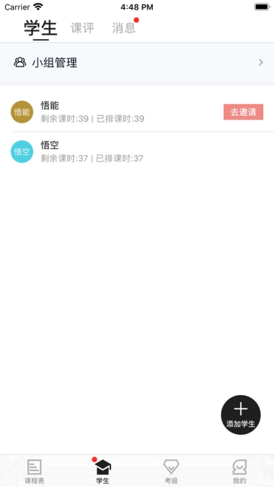 添加学生: 小组课可以添加额外的学生,点击“上课学生”右边的⊕按钮,进入“选择学生”页面。您可以将一个或多个学生添加到这一课节。额外添加的学生名称右边,会出现“加”图标。单人课无法添加学生。