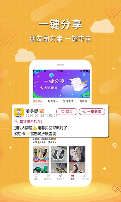 喵享惠是是一款能给优惠购物的手机软件,返利折扣随时下单,网上海量优品任你挑选,国内超多电商汇聚于此。商品下单购买都会比较省钱,分享推广还有佣金可以赚到手,极速网购乐趣多多。每天分享各大电商平台的商品优惠券福利,用户可以免费领取,下单即可抵现,省钱的同时分享好友还能获得佣金奖励,需要的朋友欢迎下载使用吧。