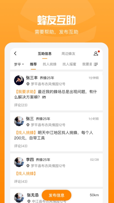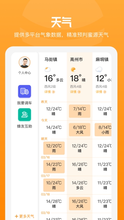 追花族app是一款实用的关于养蜂人的手机软件,优质的蜂蜜需要养蜂人细心的培养,才能得到可以在这里查看未来几天的天气,查看适合采蜜的日期,获取完整的蜂源地信息,与其他养蜂人进行互动讨论,购买相关必备设施等等。追花族app专为用户养蜂工作使用,为您节省时间精力,提高养蜂效率,还能帮您推广自家产品,做到线上营销工作。