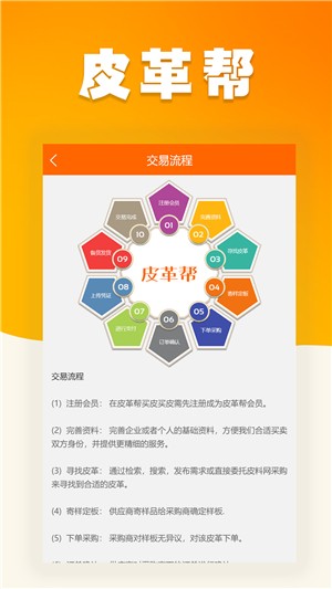 免费撮合交易、免费订单管理、订单下达后的进度管理和实时提醒、规范皮革交易程序、建立网络证据体系,进行网上皮革新产品的展示、推广,提供高附加值服务的渠道机构,拥有客户管理、信息反馈、数据库管理、决策支持等功能的服务平台。