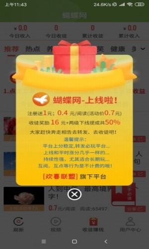 蝴蝶网是一款欢喜联盟旗下的手机赚钱平台,新人下载蝴蝶网app就送现金奖励,精选的新闻资讯内容,让大家能够获得更有价值的内容阅读,采用收徒赚钱机制,收徒徒弟,轻松获得更多的分成接下来游戏爱好者小编就给大家带来这款软件的具体介绍,感兴趣的小伙伴们速来游戏爱好者看看吧~~