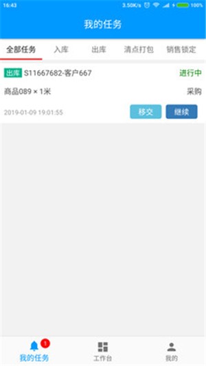 我的任务查看:随时查看我的任务信息,包括销售锁定、清点打包、出入库等信息;