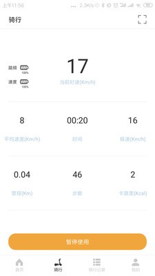 骑行页简单易用的界面包含更丰富的骑行数据,支持平均速度(Km/h)、时间、极速(Km/h)、里程(Km)、踏步(rpm)、卡路里(Kcal),不仅如此,还可以查看踏频和速度的电量,让你一目了然的数据分析。