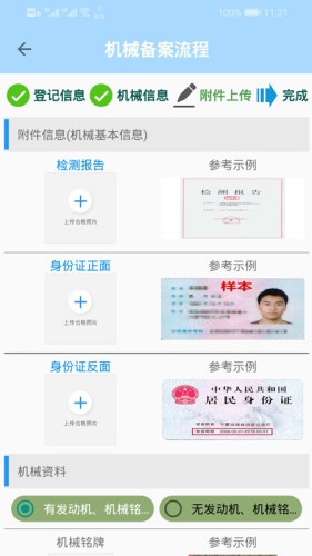 上传相关检测报告图片、还有身份证图片就能够对车主机械备案进行登记;