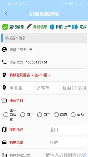 在线即可对车主机械备案登记,填写相关登记信息、机械信息,上传附件即可;