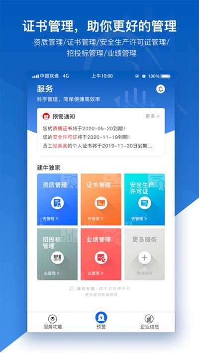 建牛资质通是非常实用的一款管理软件,提供获客系统、交易系统、结算系统、客户管理系统、员工管理系统、数据分析系统、供应链服务系统七大管理系统,拥有高效便捷的科学管理模式,提供招投标管理、证书管理、业绩管理、资质管理等等,有需要的朋友欢迎下载使用吧。