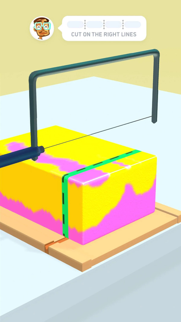 图标简单,扁平化设计,配色比较小清新。简单易上手,模拟肥皂的真实切割,释放压力。游戏中需要保证切下的肥皂厚度均匀,有一个标准线,玩家需要控制好时间切下,轻松有趣。