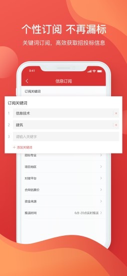 信息定制操作简单、方便,可便捷订阅关键词,查看招投信息;