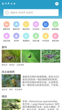 2.鸟儿图片欣赏、叫声聆听、铃声设置、铃声下载(多种鸟叫声试听,下载)、鸟类评论点赞