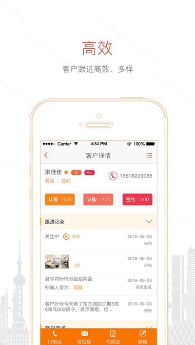 利用软件,房地产营销团队能够快捷地将客户电话存储到手机通讯录,客户跟进记录可以直接录音、拍摄现场照片上传,让信息一目了然。客户签约、认购都会在平台留下记录,便于后期审核追溯,是一款非常实用的办公软件。