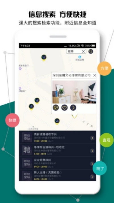 【方便快捷的入职方式】:通过拖动图标在心仪地块直观查找招聘信息,以及视频聊天快速入职,还可自主展示作品和技能让HR或客户主动找上你。