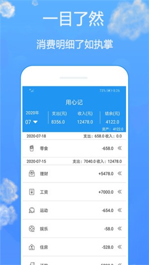 1、记账清单:用心记app详细列出用户每笔支出和收入明细数据,并自动换算结余金额;