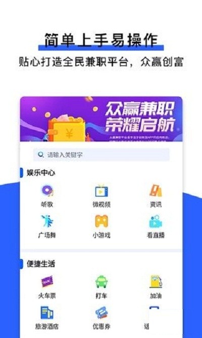 众赢时空app是一款在线兼职赚钱的手机软件,适合宝妈,大学生以及上班族在闲暇之余用来赚取外快。在众赢时空这款软件上,用户可以领取发布的相关任务,通过完成任务来赚取对应的红包奖励,任务量大,选择多,只需花短短十几分钟,动动手指即可赚钱。众赢时空,一款大家都在用的兼职软件,如果感兴趣的话,就马上下载体验吧!