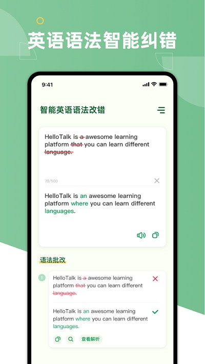 基于HelloTalk日均千万次的真实改错数据,AI Grammar Checker能够更加真实准确地像真人母语朋友一样,随时在线帮你纠正英语语法错误,更懂你想表达的内容。每一处修改,都更贴合母语者的语言表达习惯,让你的英语表达更加地道!