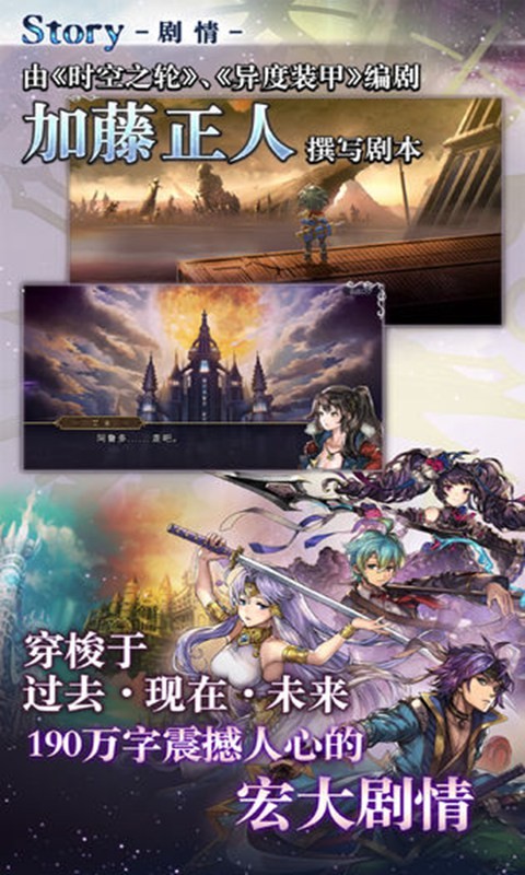 3、通过《备长炭》和《海猫鸣泣之时》被众多玩家熟知的江草天仁,负责了本作的插画美术部分,仅是角色立绘多达100余幅,大部分角色根据其成长线绘制了相应的初始形态、5星形态以及AS形态。并且游戏中的场景美术、NPC和BOSS等内容的原画,则是根据各不同时代的文化所创作,有着分明的区别性,非常的考究。