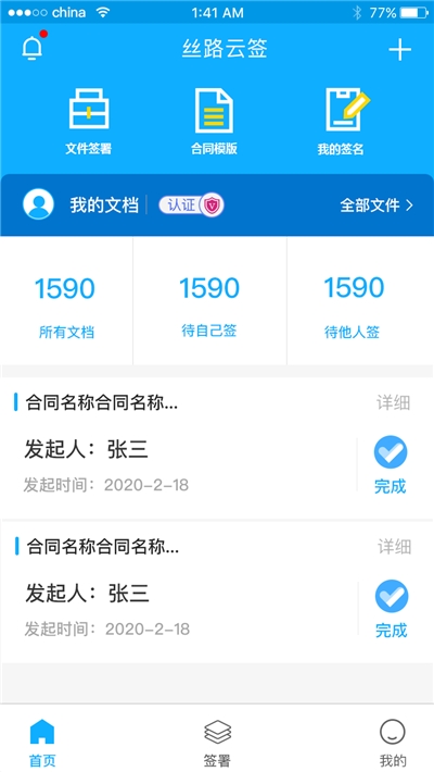 丝路签app是一款权威的第三方电子合同签署平台,使用这款软件可以轻松地管理电子合同,能够自定义合同模板,能够快速的推送签约通知,快速的实现线上签约,具有同样的法律效应。