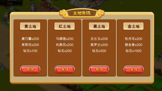 如;青土地升级黄土地需要200康乃馨+200茉莉花+100钻石,就可以升级一块黄土地,黄土地可以种出2级花,土地等级越高才能种出高级花。