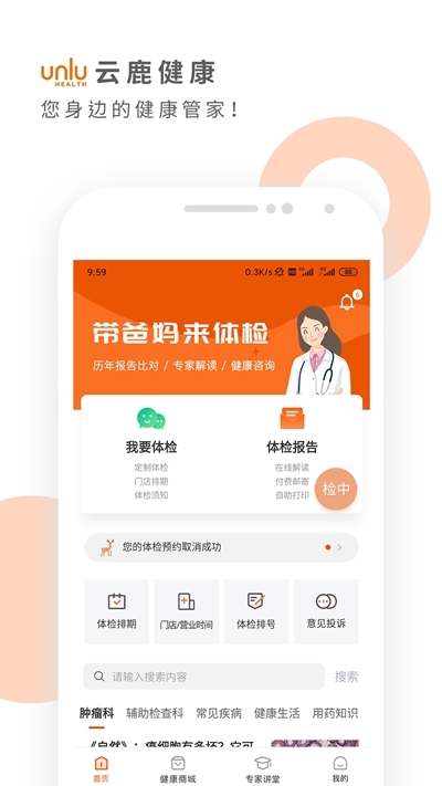 【健康体检】 涵盖检前环节体检产品购买、体检咨询、体检预约;检中环节包括体检自助登记、自助排号、自助加项、提价评价;检后环节包括报告查询、报告解读、对比分析等。