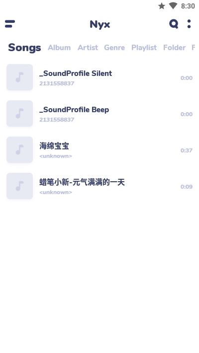 Nyx Player app是一款功能强大的播放器,它的UI设计十分简洁漂亮,可以说还有点可爱。颜值高是这款软件一大特点,绝对能让人一眼看了就爱不释手。当然,这款播放器的功能也是非常强大,支持各种格式的音乐文件,而且音质非常出色,喜欢音乐的朋友千万不要错过了,赶紧下载Nyx Player app体验吧!