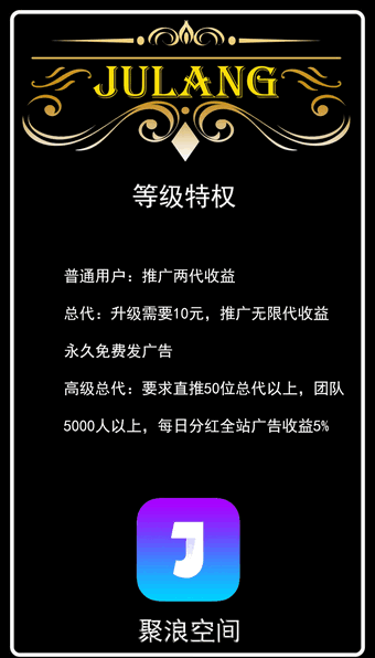 3.聚浪空间巅峰问世、超强站长功能,独立APP运营、全网首家商城广告平台人脉圈、全网招募100名实力团队长,无限代裂变暴利,10远撬动百万,2020真正黑马广告平台!