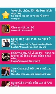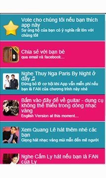 Bạn thích những bản nhạc vàng Việt Nam?Bạn yêu mến những giọng ca bất hủ của dòng nhạc trữ tình Việt Nam?Bạn có niềm đam mê đối với các giai điệu xưa?Ứng dụng “♬Nghe Nhac Vang Hai Ngoai Hay♬” sẽ mang đến cho bạn một kho những ca khúc bất hủ được trình bày bởi các giọng ca đầy truyền cảm. Với ứng dụng này, bạn sẽ có được:- Tổng hợp nhạc vàng theo từng ca sĩ: Phi Nhung, Chế Linh, Trường Vũ, Ngọc Sơn, Dương Ngọc Thái, Cẩm Ly, Quang Lê, Duy Khánh, Tuấn Vũ và nhiều ca sĩ khác.- Công cụ để lưu lại ý tưởng nếu bạn muốn sáng tác nhạc.- Công cụ để lên lịch cho những công việc trong ngày. Quản Lý thời gian tốt hơn để nghe được nhiều bản nhạc hay và tận hưởng thời gian hiệu quả!- Nghe nhạc trữ tình và lãng mạn gợi ca tình cảm quê hương.- Nhạc vàng hay và nổi tiếng trước và sau năm 1975.- Trò chơi để giái trí và luyện trí não sau khi nghe nhạc.- Nhạc vàng Remix - Thử cảm giác mới với cách hòa nhạc mới của những bản nhạc kinh điển.- Công cụ giúp bạn scan những lời ca khúc hay trên sách và báo mà bạn thích và chuyển thành file PDF để đọc sau và chia sẻ với mọi người.- Thu âm giọng hát hay của bạn và của live show các ca sĩ - Làm kỉ niệm, nghe lại hay chia sẻ với bạn bè…- Hát Karaoke- Xem hình ảnh của các ca sĩNhóm chúng tôi làm phần mềm này để giúp mọi người truy cập thông tin cũng như giải trí nhanh chóng từ chiếc điện thoại của bạn. Hãy bấm INSTALL để tải ngay và chia sẻ với mọi người nếu các bạn thích ứng dụng này của chúng tôi. Chân thành cảm ơn. Chúc các bạn và các em chơi game thật vui!Cool Viet App Team* Lưu ý: một vài chức năng cần kết nối mạng nên các bạn nhớ bật mạng không dây để tận hưởng đầy đủ nhất nhé. Nếu trang chậm tải thì có thể do máy chủ hoặc mạng chậm, các bạn chịu khó chờ một tí nhé. Vì kết nối mạng nên nhiều khi các bạn sẽ mất phí hòa mạng chứ phần mềm không hề tính bất kì phí nào.* Legal Disclaimer: Any content, including but not limited to, images, text, sound bytes, phrases, logos, names, ♬Nghe Nhac Vang Hai Ngoai Hay♬les, not owned by CoolVietApps belongs to their respected owners. We do not take credit nor claim to take credit for any of said content. Any content used is used at a fan-base stand point. We simply provide free positive advertising. If you for any reason own content produced by CoolVietApps and do not wish to receive, no-obligation, free advertising to your fans, contact us immediately with the proper documentation to prove the material is yours and we will remove it upon request. If you want specific credit like your name/website/business/etc to be advertised we will do that as well. There is no need to take legal action, we will respect the owners wishes, just contact us first. Any content used without permission does follow under sections 107 through 118 of the copyright law ♬Nghe Nhac Vang Hai Ngoai Hay♬le 17, U. S. Code. FAIR USE section 107 document FL-102, however we respect our users and producers therefore we will remove it upon request like stated above. ALL CONTENT NOT OWNED BY CoolVietApps BELONGS TO THEIR RESPECTED OWNERS. SUPPORT THEM IN ANY WAY YOU CAN. This application is NOT a officially licensed product and no copyright or trademark infringement is intended. This applications is an unofficial fan based application.Ứng dụng “♬Nghe Nhac Vang Hai Ngoai Hay♬” sẽ mang đến cho bạn một kho những ca khúc bất hủ được trình bày bởi các giọng ca đầy truyền cảm. Với ứng dụng này, bạn sẽ có được:- Tổng hợp nhạc vàng theo từng ca sĩ: Phi Nhung, Chế Linh, Trường Vũ, Ngọc Sơn, Dương Ngọc Thái, Cẩm Ly, Quang Lê, Duy Khánh, Tuấn Vũ và nhiều ca sĩ khác.- Công cụ để lưu lại ý tưởng nếu bạn muốn sáng tác nhạc.- Công cụ để lên lịch cho những công việc trong ngày. Quản Lý thời gian tốt hơn để nghe được nhiều bản nhạc hay và tận hưởng thời gian hiệu quả!- Nghe nhạc trữ tình và lãng mạn gợi ca tình cảm quê hương.- Nhạc vàng hay và nổi tiếng trước và sau năm 1975.- Trò chơi để giái trí và luyện trí não sau khi nghe nhạc.- Nhạc vàng Remix - Thử cảm giác mới với cách hòa nhạc mới của những bản nhạc kinh điển.- Công cụ giúp bạn scan những lời ca khúc hay trên sách và báo mà bạn thích và chuyển thành file PDF để đọc sau và chia sẻ với mọi người.- Thu âm giọng hát hay của bạn và của live show các ca sĩ - Làm kỉ niệm, nghe lại hay chia sẻ với bạn bè…- Hát Karaoke- Xem hình ảnh của các ca sĩNhóm chúng tôi làm phần mềm này để giúp mọi người truy cập thông tin cũng như giải trí nhanh chóng từ chiếc điện thoại của bạn. Hãy bấm INSTALL để tải ngay và chia sẻ với mọi người nếu các bạn thích ứng dụng này của chúng tôi.Chân thành cảm ơn. Chúc các bạn và các em chơi game thật vui!Cool Viet App Team* Lưu ý: một vài chức năng cần kết nối mạng nên các bạn nhớ bật mạng không dây để tận hưởng đầy đủ nhất nhé. Nếu trang chậm tải thì có thể do máy chủ hoặc mạng chậm, các bạn chịu khó chờ một tí nhé. Vì kết nối mạng nên nhiều khi các bạn sẽ mất phí hòa mạng chứ phần mềm không hề tính bất kì phí nào.* Legal Disclaimer: 