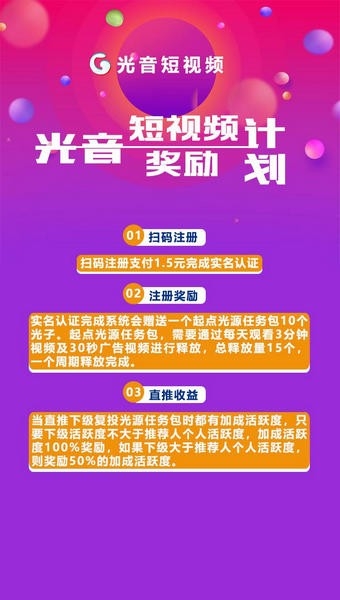 拥有短视频+直播+商城+广告+生态+区块链。你邀请的朋友在光音短视频app上看视频,打赏,直播,分享都是你赚光子的来源,光音短视频软件里的光子可以换钱,注册好,实名认证后可做任务,每天在光音短视频app上观看3分钟视频可获得0.5个光子,2天可获1个光子,操作简单,人人可做。